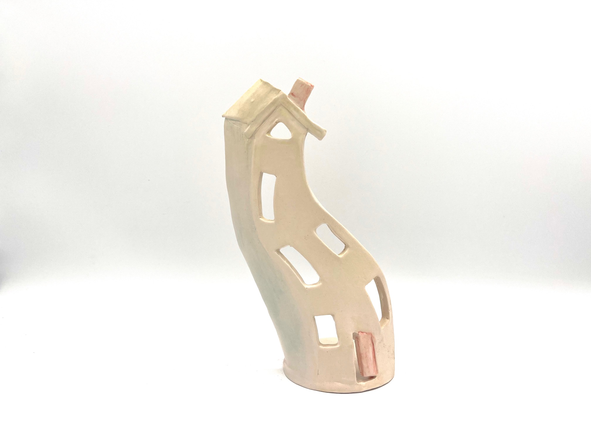 Illuminate your home with the House Perspective tealight holder, an elongated wavy ceramic house adorned with charming carved details and light red accents. This unique, stoneware masterpiece not only brightens your space but is also dishwasher and microwave safe.