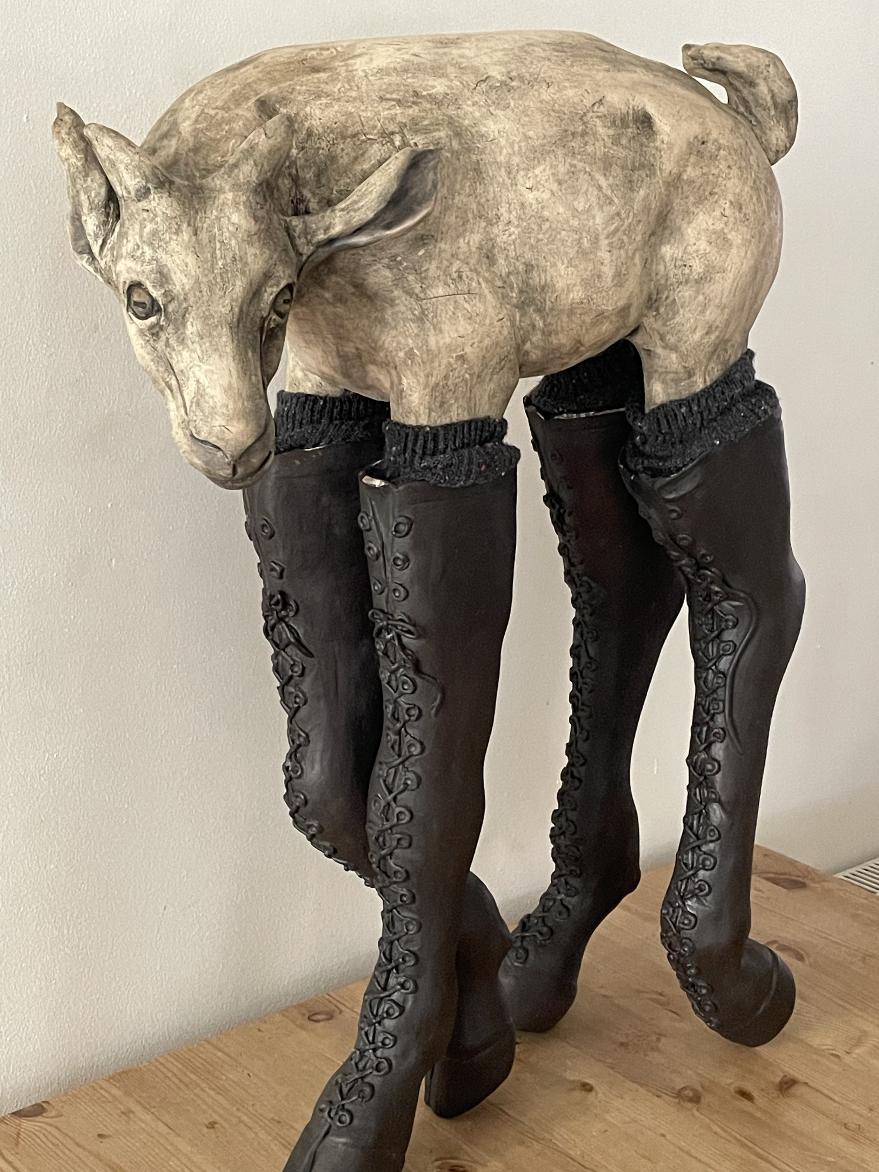 This sculpture symbolizes the idea of being ensnared by one's emotions and creating difficulties for oneself, akin to painting oneself into a corner. The goat in the sculpture is depicted balancing on extremely long boots, suggesting that it has intentionally restricted its movement and trapped itself. The artwork features a ceramic goat adorned with ceramic long boots and knitted socks, all polished for a finished appearance.