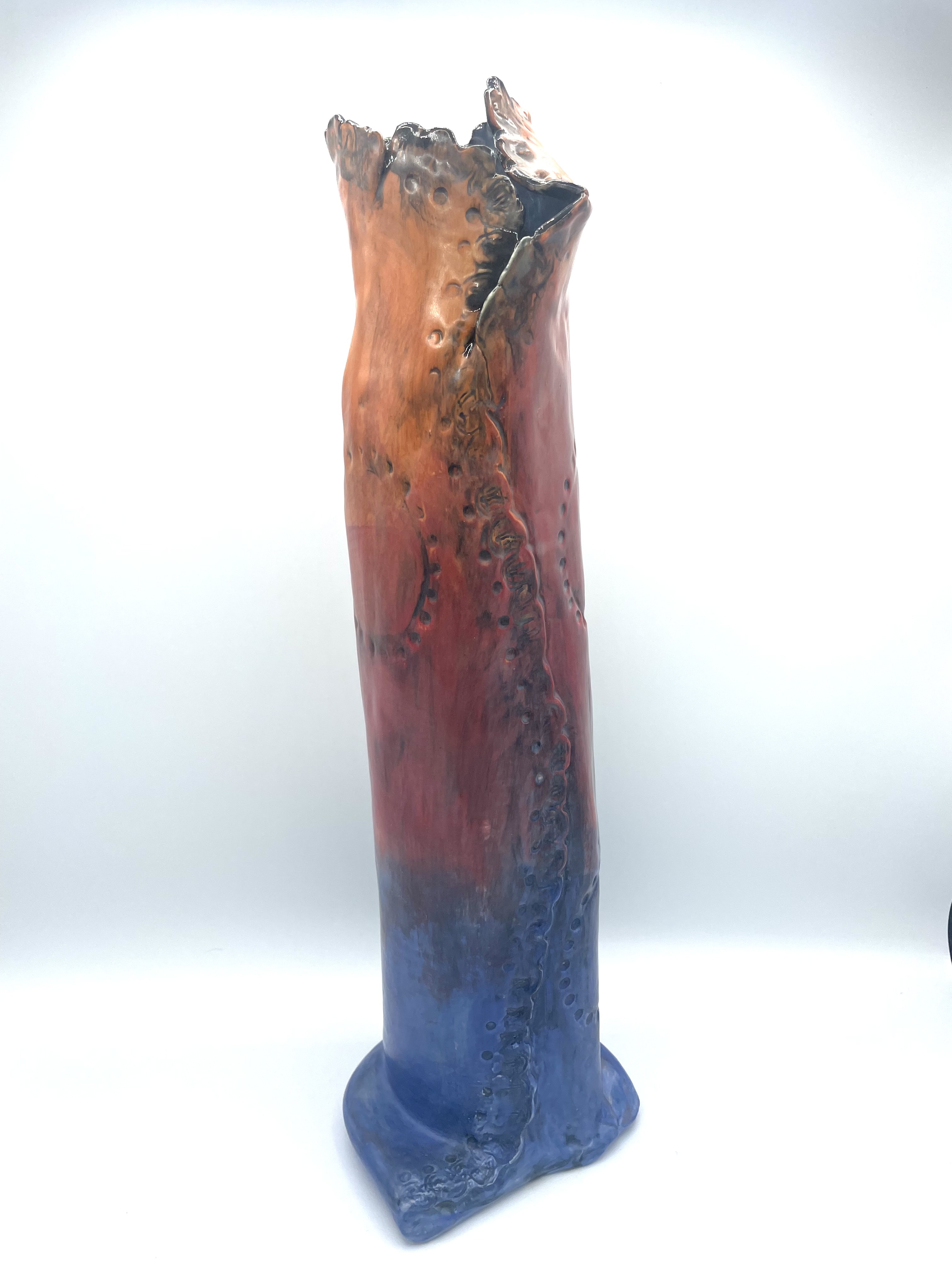 Introducing the Sunset Vase, a captivating piece that embodies the vibrant hues of twilight. This vase features a glossy finish achieved through skillfully blended glazes, creating a stunning transition from blue to fiery red and orange. The exterior is adorned with intricate engraved details enhanced by a deep black finish, adding depth and dimension.