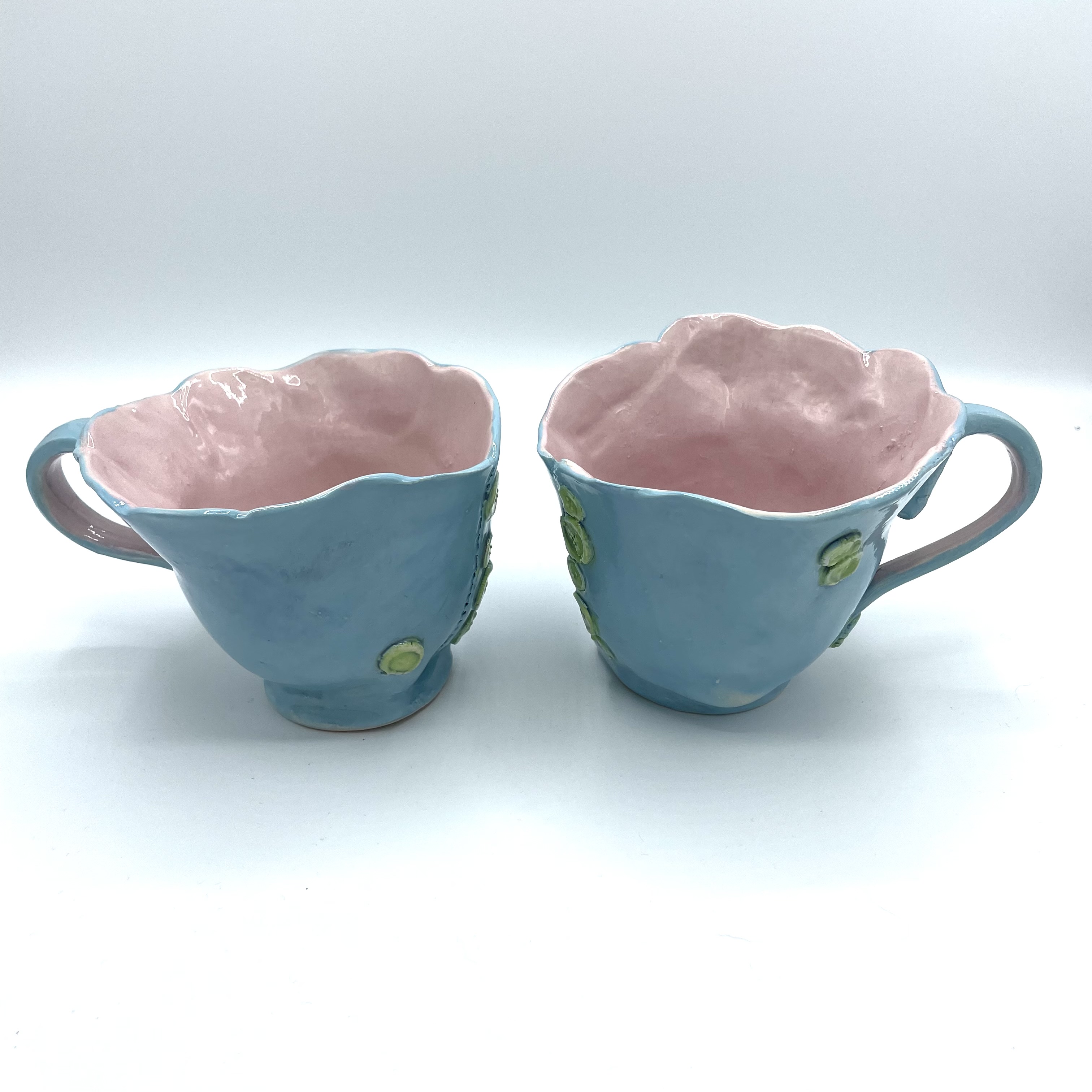 The exterior features a calming blue hue, which beautifully contrasts with the vibrant pink interior, creating an inviting and visually pleasing colour combination. The asymmetrical and irregular shape of each cup adds to their distinctive character, making every sip an enjoyable experience.