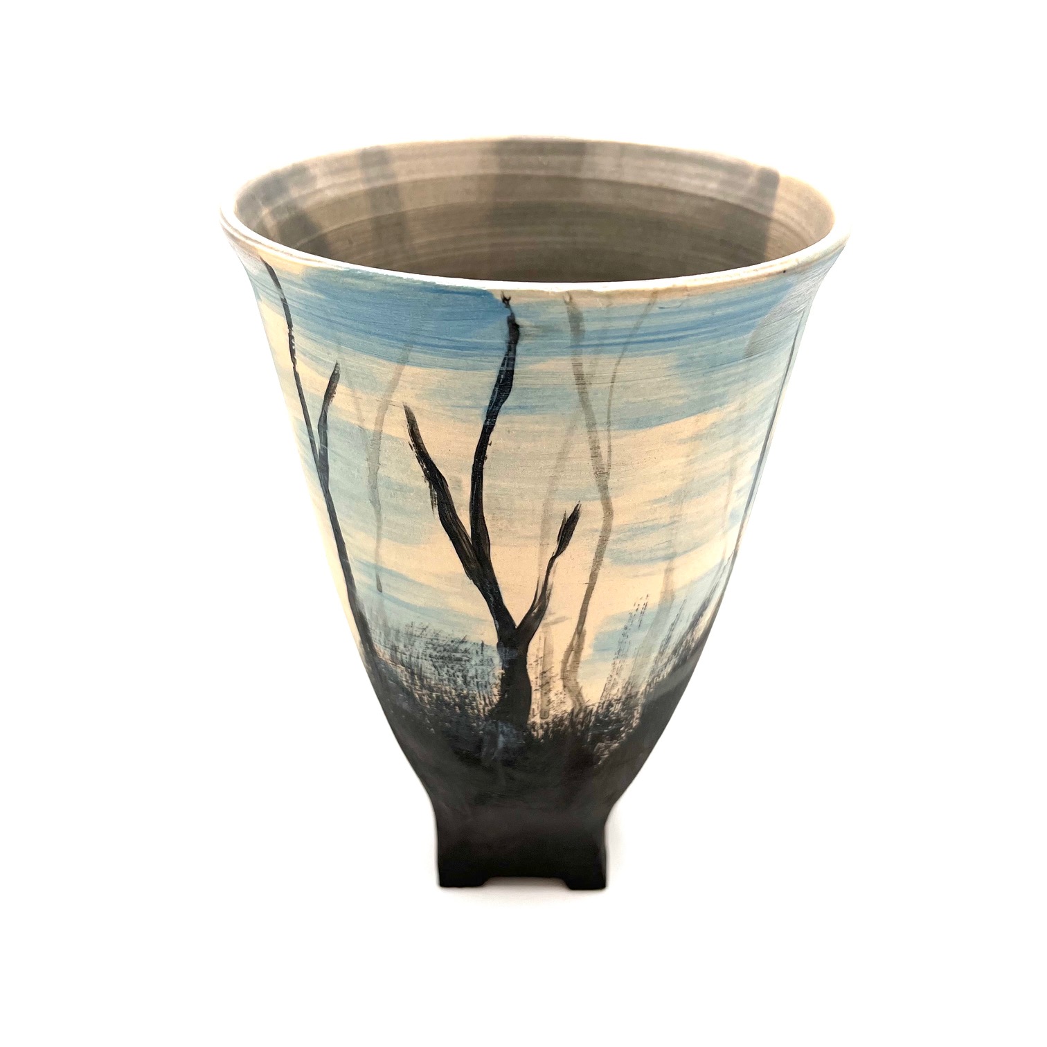 Introducing the Woodland Vase, a captivating piece that brings the serene beauty of nature into your living space. This vase features a matte glaze that provides a sophisticated and muted backdrop for its intricate woodland design. The exterior showcases delicate black details of woodland scenes, set against a grey-blue background, creating a stunning visual narrative that evokes the tranquility of a forest.